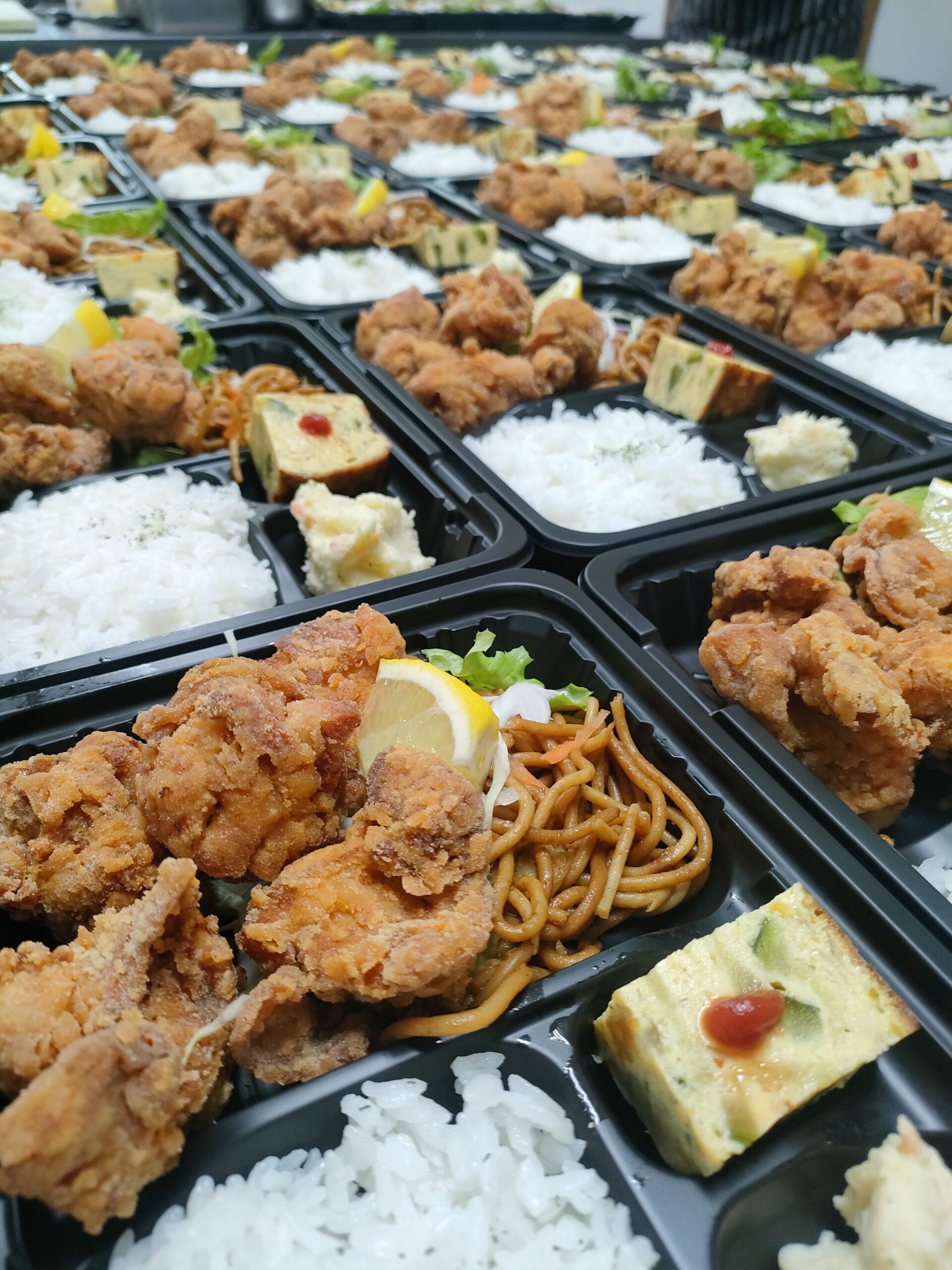 ガッツリ系がご希望ということで、しっかり肉メインで美味しいお弁当を105食、昼・夜の2回ご用意させていただきました。