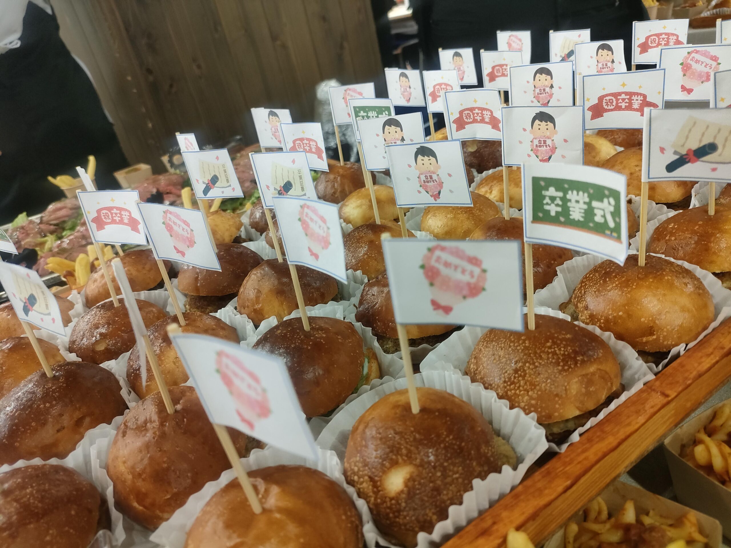 卒業をイメージしたイラストピック付きのミニバーガーにキッシュなどのフィンガーフード。
