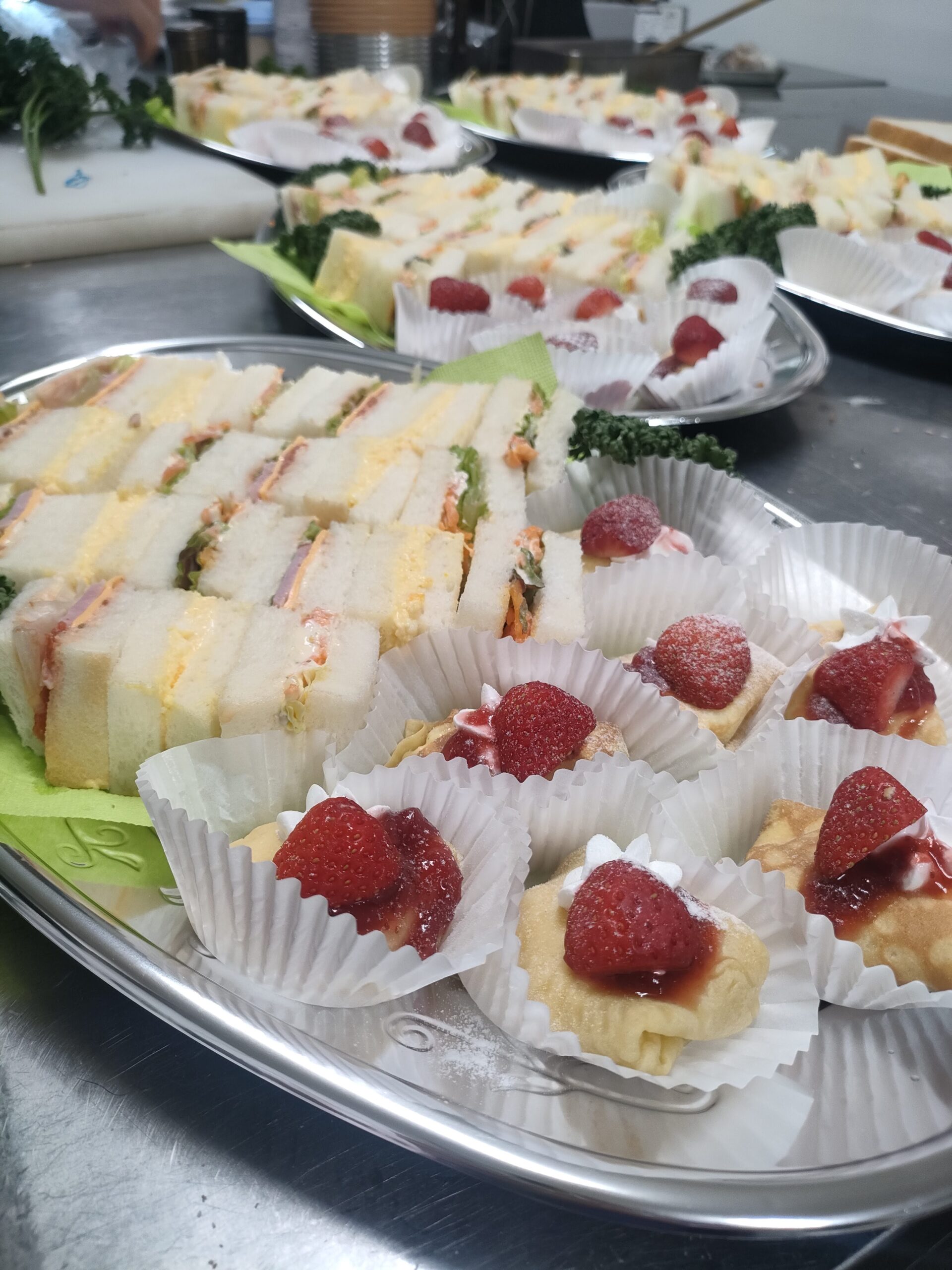よくご依頼をいただいている地元の女子大学様へ、オードブルとサンドイッチ、デザートの大皿盛りをお届けしました。